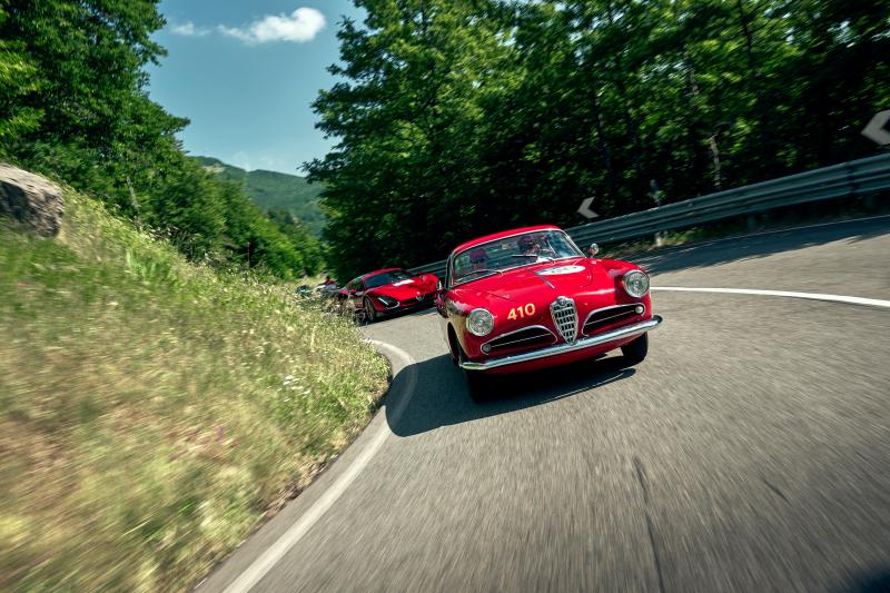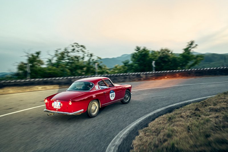 En acción sobre las carreteras de la 1000 Miglia responde a maniobras exigentes, mostrando su equilibrio entre elegancia y agresividad, entre pasado mítico y presente exclusivo.