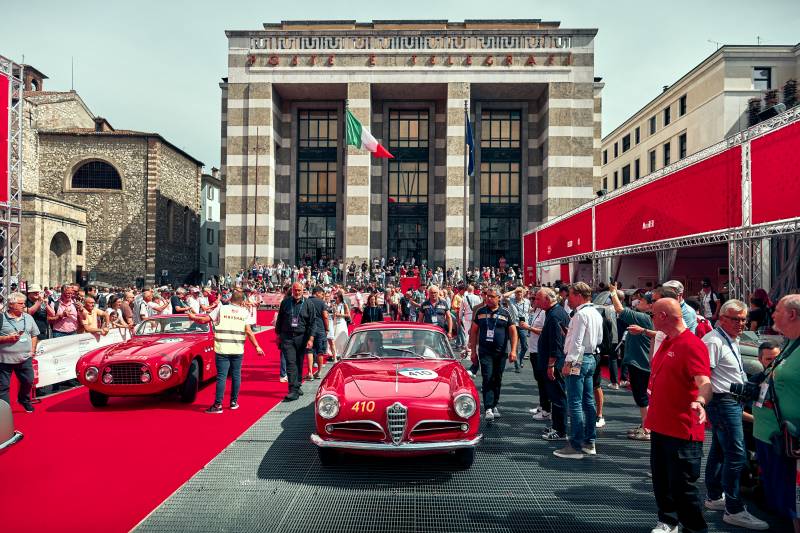 Antes del arranque, en la Piazza della Vittoria se verifican aspectos deportivos y técnicos. Se colocan precintos de plomo, se comprueban permisos y homologaciones, y se analizan las condiciones del vehículo. Este ritual da paso a la caravana, entre aplausos y entusiasmo popular.