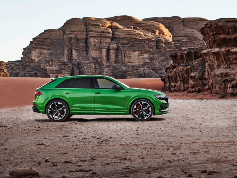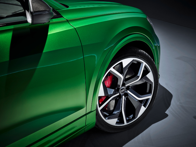 El exterior del modelo atraerá todas las miradas, gracias en gran parte a la personalidad del frontal. En combinación con las entradas de aire laterales y las inserciones laterales del paragolpes en negro brillante y otros elementos aerodinámicos en aluminio mate, este SUV coupé de Audi Sport GmbH desprende carácter deportivo por los cuatro costados.