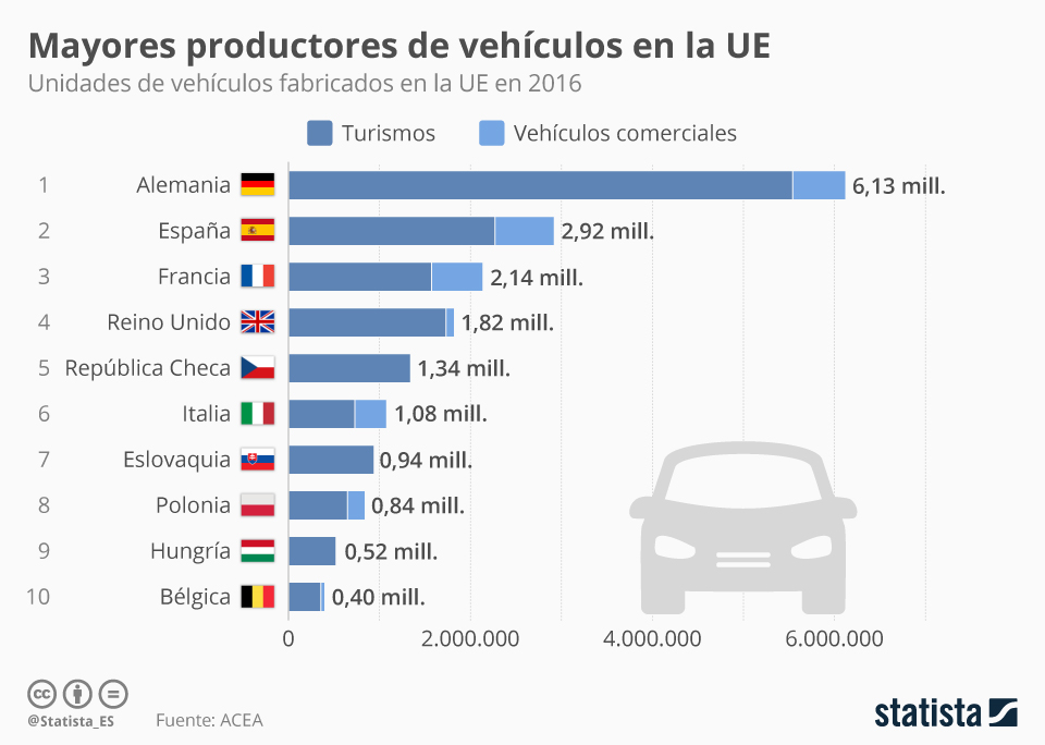 Según datos de la European Automobile Manufacturers Association, en 2016 España era el segundo mayor fabricante de vehículos de la Unión Europea, con alrededor de 2,92 millones de unidades producidas, 2.3 millones de las cuales son turismos. Este solo fue superado por Alemania, con 6,13 millones.