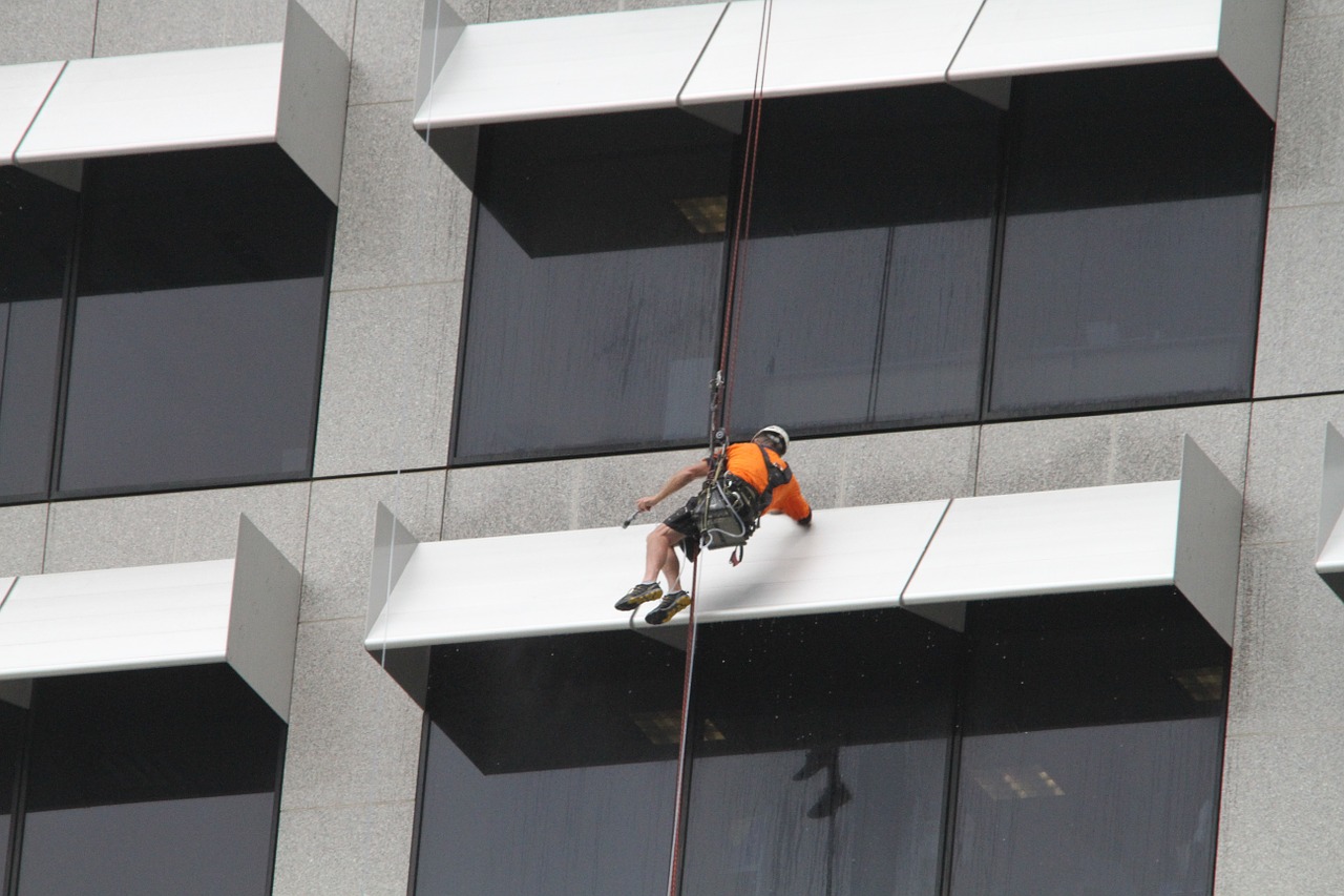 Limpiar un edificio de cristales a gran altura, además de peligroso, es poco demandado. No sabemos si es un empleo vocacional, pero desde luego sí que requiere un gran atrevimiento.