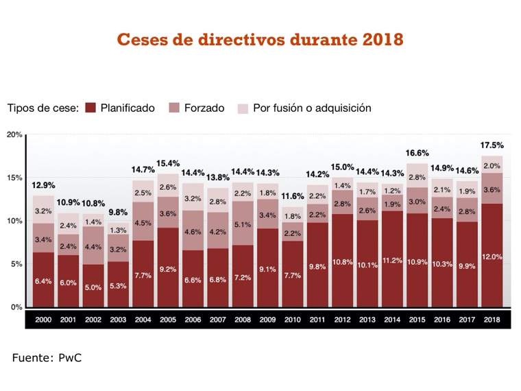 Las sustituciones de consejeros delegados (CEO) en 2018 alcanzó cifras récord, con el relevo de 438 altos directivos en las empresas cotizadas más grandes del mundo, según refleja el informe CEO Success elaborado por Strategy&, consultora de estrategia de PwC. Este informe, que reúne datos desde 2000 hasta 2018, destaca que precisamente 2018 acabó con la caída del 17,5% de los primeros ejecutivos de más de 2.500 empresas, el mayor porcentaje registrado desde que empiezan a recoger datos para este estudio.
