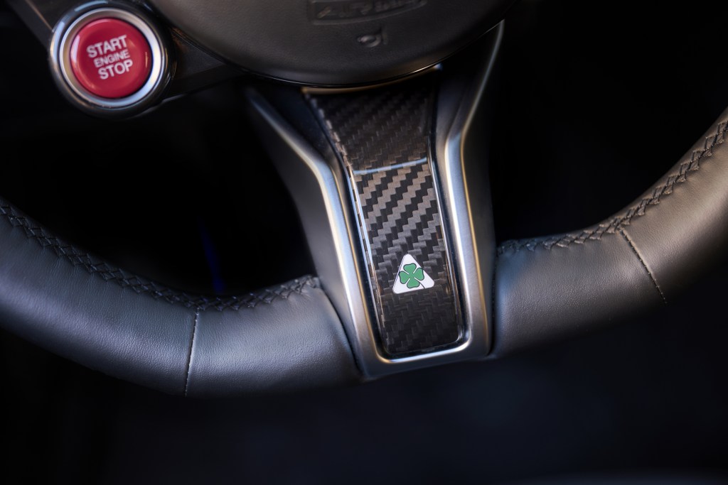 En el interior se exhibe la misma caracterización deportiva, donde prevalece la exclusiva combinación de cuero negro y alcantara, realzada por las nuevas y exclusivas costuras doradas visibles y el innovador acabado 3D de carbono auténtico para el salpicadero, el túnel central y el panel de las puertas. El salpicadero está dominado por el pespunte del número conmemorativo «100» junto al Quadrifoglio en el distintivo color dorado. El volante está forrado en cuero y Alcántara con costuras negras e inserciones de fibra de carbono.