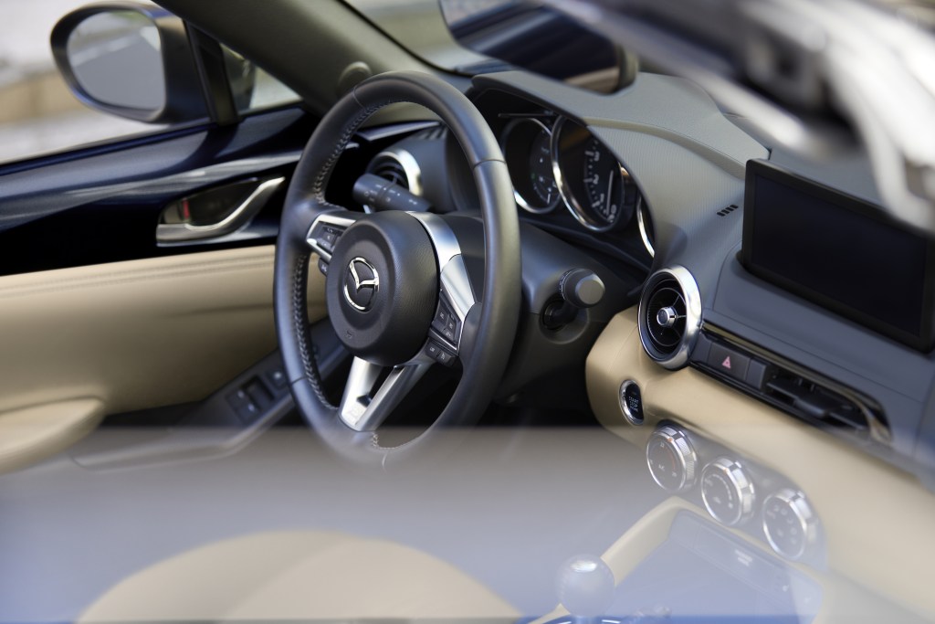 En el habitáculo, los asientos están tapizados en un nuevo material que evita que el conductor se deslice durante la conducción deportiva. Entre las mejoras interiores destaca el nuevo espejo retrovisor sin marco, la pantalla multimedia táctil con el sistema Mazda Connect, que ahora es de 8,8 pulgadas y ha ganado en funcionalidad, la puesta al día del panel de instrumentos del conductor y dos puertos USB-C.