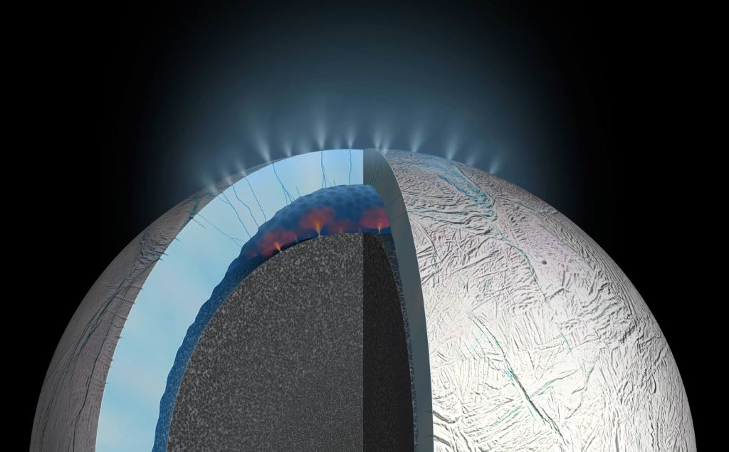 La nave espacial Cassini de la NASA fue la que, en su gran periplo de dos décadas, descubrió que Encélado expulsa columnas de hielo gigantescas (algunas del tamaño de Latinoamérica) a una velocidad asombrosa de 400 metros por segundo, trazando un camino, la más destacada de estas columnas de vapor de agua, 20 veces más grande que la propia luna.