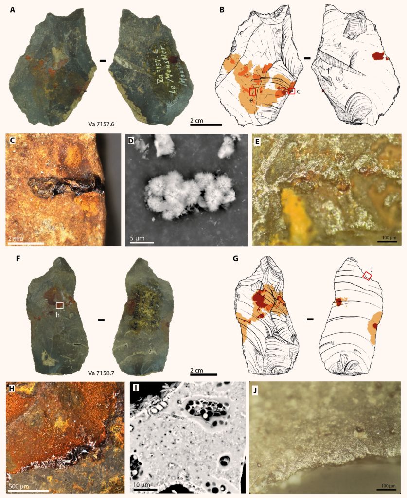 Los investigadores realizaron un nuevo análisis de herramientas de piedra de 40.000 años de antigüedad del icónico sitio de Le Moustier en Francia (que fueron creadas por los neandertales durante el Paleolítico Medio, hace entre 120.000 y 40.000 años). Los exámenes químicos de residuos coloridos en cinco herramientas fabricadas por neandertales revelaron rastros de ocre goethita y betún, un componente del petróleo crudo varios raspadores, escamas y hojas, evidenciando que se trataba de un sofisticado adhesivo de múltiples componentes. Estas herramientas tienen un parecido sorprendente con las fabricadas por los primeros humanos modernos, pero llevan una firma neandertal distintiva en su fabricación.