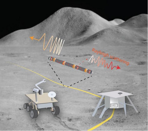 Aquí es donde entrará DAS (Distributed Acoustic Sensing). DAS no solo observa la actividad sísmica, sino que utilizando las pequeñas imperfecciones de un largo cable de fibra óptica tendido bajo el regolito de la luna, transformará estos defectos en una densa serie de sensores sísmicos diminutos. Cuando la actividad sísmica perturbe la fibra, los investigadores podrán examinar los cambios en los pulsos reflejados para aprender más sobre las ondas sísmicas resultantes.