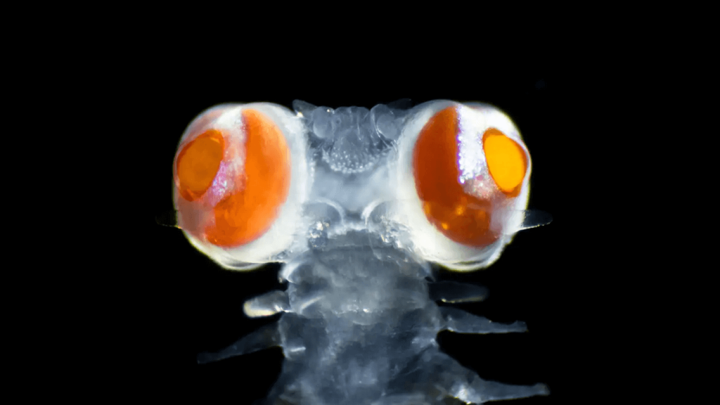 La característica más llamativa de este invertebrado marino son sin duda sus ojos. Imagina una criatura no más grande que un trozo de espagueti, con dos enormes orbes dominando su cabeza. Así es Vanadis. Y sus ojos pesan, aproximadamente, veinte veces más que el resto de su cabeza. Parecen fuera de lugar; como si le hubieran atado al cuerpo dos globos gigantes de color rojo brillante.