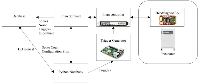 Si bien el concepto se parece mucho a cómo se utilizan las redes neuronales artificiales (RNA) en la informática actual, es necesario desarrollar nuevos métodos para estos sistemas biológicos. La información se transmite de un lado a otro a través de convertidores analógicos digitales (controlador Intan RHS 32) que funcionan a una frecuencia de muestreo de 30 kHz y una resolución de 16 bits.