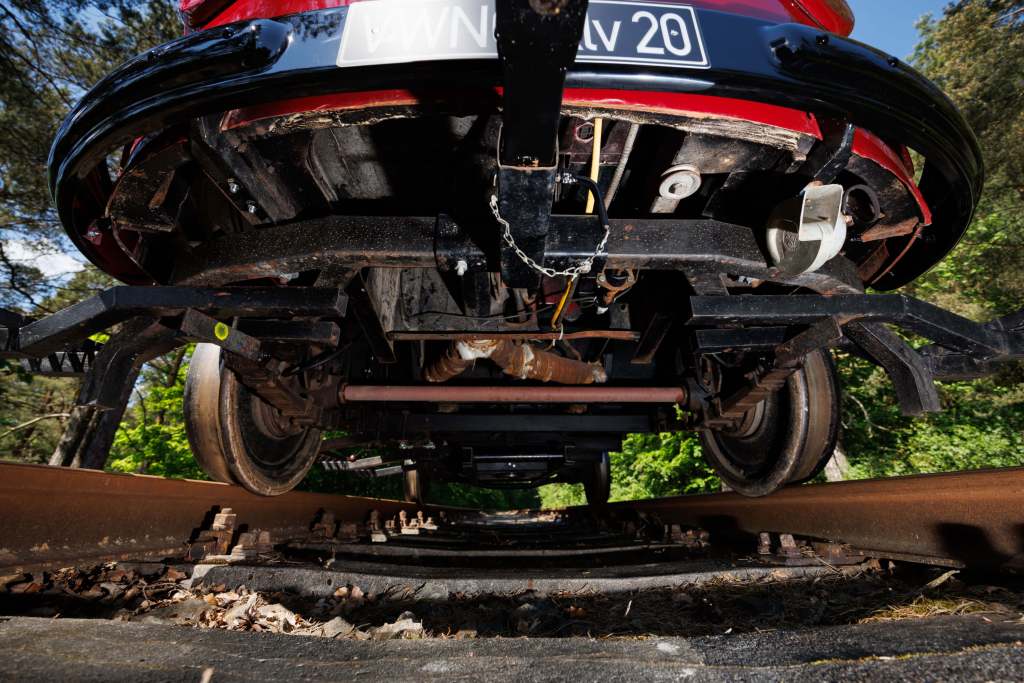 El vehículo está equipado con un dispositivo hidráulico de elevación y giro, con una plataforma giratoria que se apoya firmemente en las cabezas de los raíles. Se acciona mediante una bomba manual, lo que permite girar el vehículo sin esfuerzo en el sentido de la marcha deseado». Así describía la empresa Beilhack el insólito producto que había fabricado. El vehículo carece de espejo retrovisor y de volante, algo que no sorprenderá a los aficionados a los trenes, pero que resultará totalmente desconocido para los seguidores del Bulli. Recorrer los primeros metros es una experiencia verdaderamente surrealista. Pero uno se acostumbra rápidamente al rumor constante de las vías y empieza a disfrutar del paisaje.