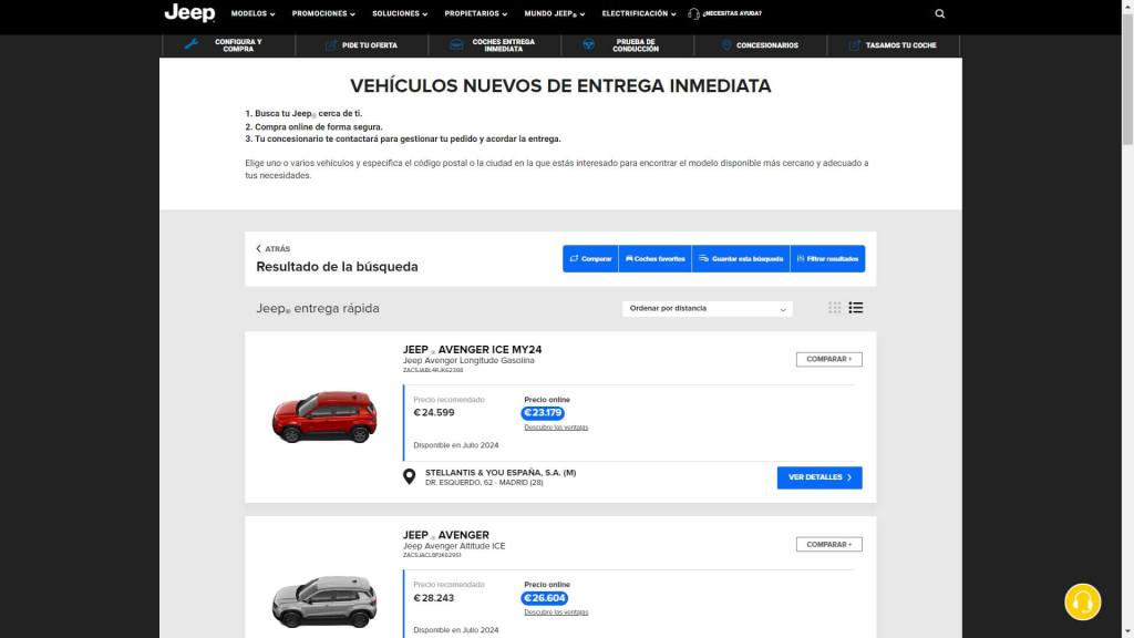 Además de poder configurar con total libertad cualquier modelo de la gama Jeep con colores, motorizaciones, acabados, opciones e, incluso, accesorios y poder realizar el proceso de compra online, la marca estadounidense ofrece la posibilidad de acceder al stock de su red de concesionarios para elegir un vehículo nuevo determinado a precios muy interesantes.