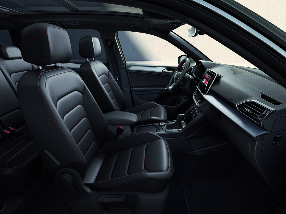 El volante del Tarraco FR luce su logo y, cómo no, es achatado en la parte inferior. Destacan los asientos tipo bucket con reglaje eléctrico para el conductor y función memoria. Además, están tapizados en Alcántara, un tejido 100% deportivo.