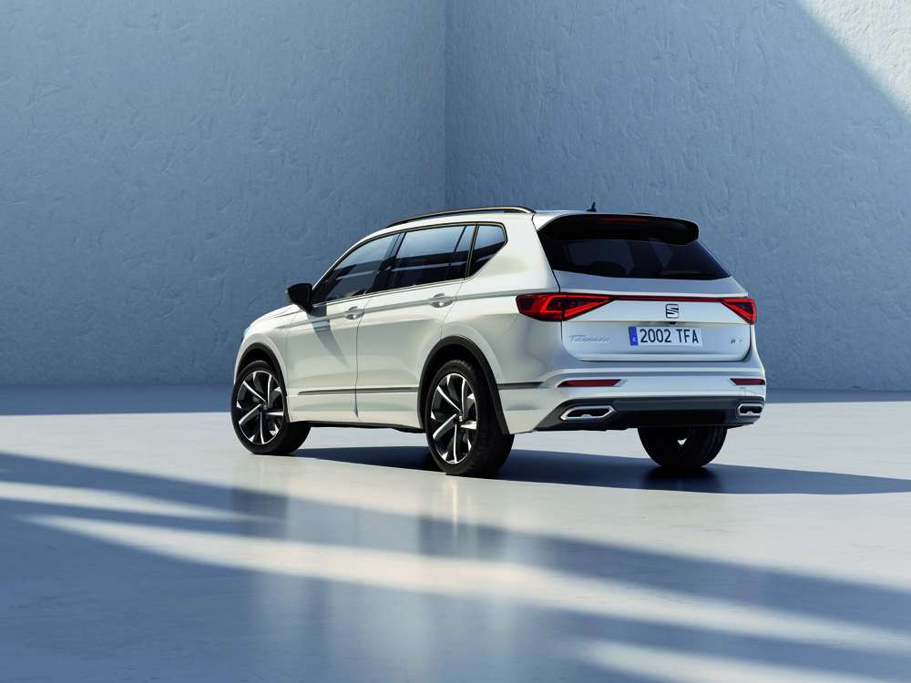 El Seat Tarraco FR luce una parrilla específica de color negro y un paragolpes de diseño más afilado. Los pasos de rueda son del mismo color que la carrocería y han sido ensanchados. El logo FR siempre está presente en la calandra y el portón trasero.