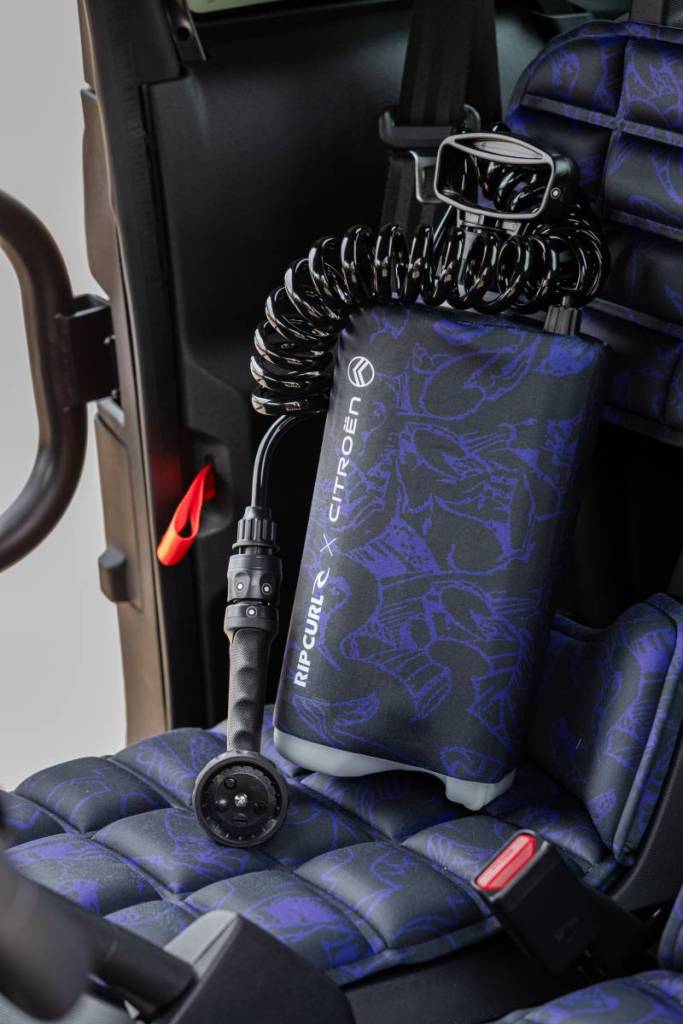 Este concept no se queda en la estética. Incorpora una serie de accesorios diseñados con el asesoramiento directo de Rip Curl: alfombrillas fabricadas a partir de trajes de neopreno reciclados, una ducha portátil, bolsa estanca para la ropa mojada y una riñonera que se fija al volante, entre otros.