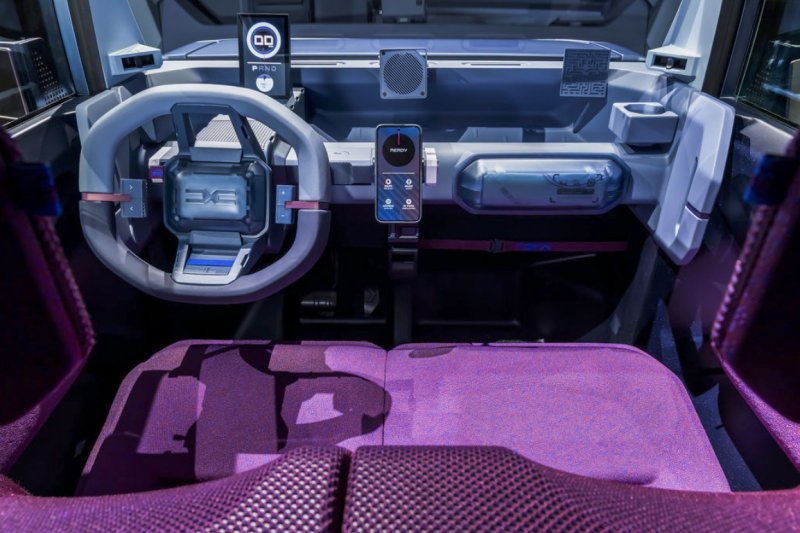 A pesar de su tamaño, el interior del Hipster Concept es amplio y funcional, con posiciones de conducción similares a las del Sandero y soluciones como ventanillas correderas o un parabrisas muy vertical para maximizar espacio.