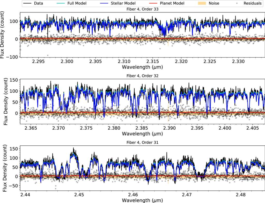 Aunque a primera vista parece un gráfico técnico, representa un avance clave para entender cómo se forman los planetas y evolucionan sus atmósferas. Los residuos (puntos grises) muestran cuán bien el modelo se ajusta a los datos, destacando la precisión de las técnicas empleadas. Este tipo de análisis ha permitido determinar que PDS 70b tiene una composición rica en agua, pero sorprendentemente baja en carbono, lo que desafía las ideas tradicionales sobre la formación planetaria. Esta imagen no solo muestra datos, sino también el poder de la tecnología moderna para desentrañar los secretos del universo.