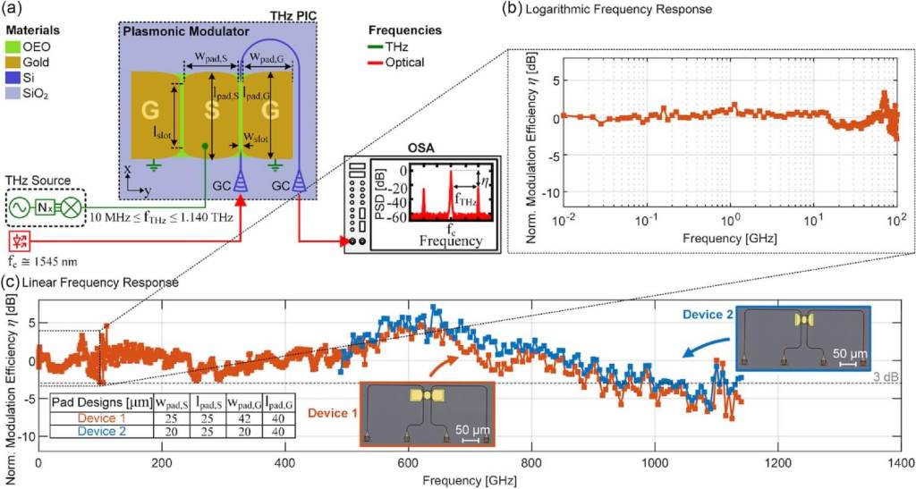 El secreto está en su estructura nanométrica, que aprovecha las propiedades de los plasmónicos. Estos materiales permiten que la luz interactúe con los electrones libres del oro, logrando una modulación extremadamente veloz. Según el estudio publicado en Optica, “el modulador plasmónico muestra una respuesta de frecuencia más allá de 1 THz, lo que demuestra su idoneidad para circuitos fotónicos integrados de terahercios”.
