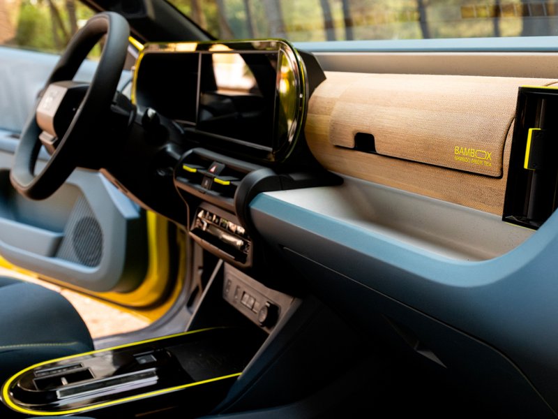 FIAT ha integrado la sostenibilidad en el diseño de forma visible y emocional. Cada Grande Panda utiliza plástico procedente de unos 140 envases, convirtiendo los detalles azules del interior en un gesto estético y, a la vez, ecológico.