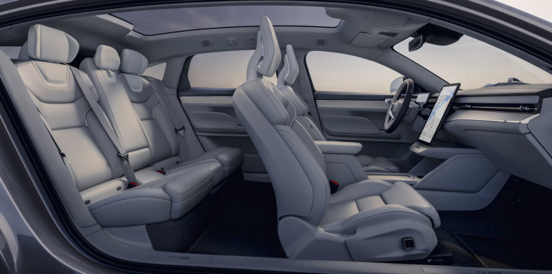 El habitáculo refleja la filosofía de diseño escandinavo: líneas limpias, materiales de calidad y un ambiente luminoso. Incorpora una pantalla central de 14,5 pulgadas con Google integrado, un cuadro de instrumentos digital, un HUD proyectado en el parabrisas y un sistema de sonido Bowers & Wilkins con 25 altavoces y tecnología Dolby Atmos.