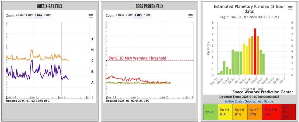 En esta gráfica, se observa que el 1 de enero hubo un aumento moderado de actividad (nivel C), lo que indica una llamarada solar activa. Estas llamaradas emiten radiación y partículas cargadas que, al combinarse con otros factores, pueden intensificar las tormentas geomagnéticas. Aunque la actividad de rayos X no fue extrema, contribuyó al fenómeno observado.