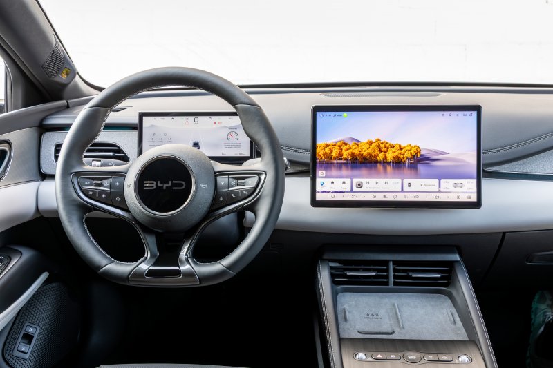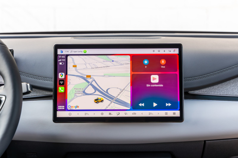 En el centro del habitáculo destaca una pantalla de infoentretenimiento de 12,8” o 15,6” según el acabado, con resolución Full HD y conectividad total. El sistema integra navegación, control por voz y actualizaciones OTA.
