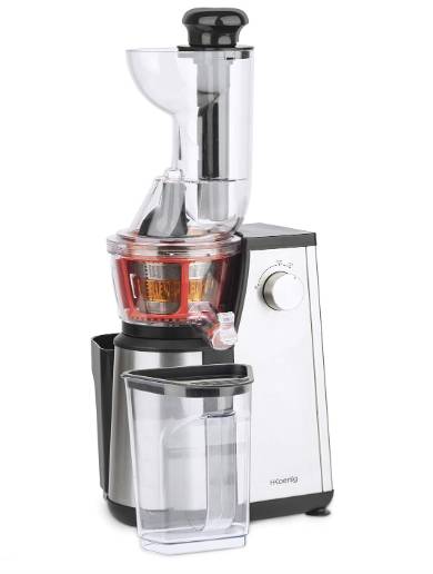 Es el turno de una licuadora de prensado en frío como es la H. Koenig Vitamin+ GSX24. Presenta una velocidad de rotación considerada lenta, algo positivo, dándole tiempo a extraer hasta la última gota de zumo, expulsando la pulpa totalmente seca. Tiene una potencia de 400 W lo que la hace especialmente eficiente. Su diseño es vertical, muy alto y con unos acabados muy premium. Presenta también una gran capacidad tanto para la pulpa como para el zumo.