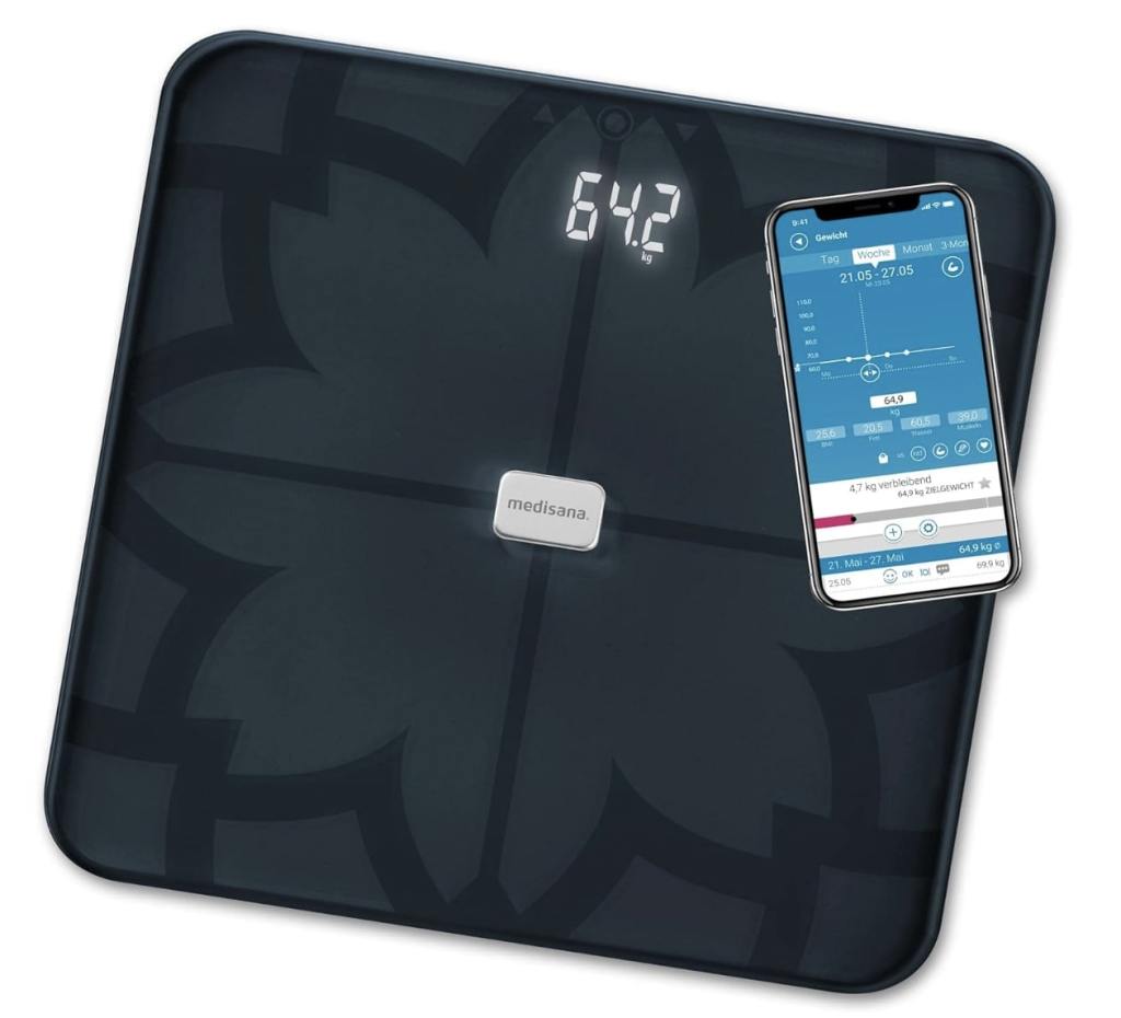 En la gama media de las básculas inteligentes nos encontramos con el modelo Medisana BS450 que con un precio muy razonable nos va a ofrecer prestaciones muy destacadas. Es capaz de medir el peso, la grasa corporal, la masa muscular, el peso óseo y el agua corporal. También te va a calcular el IMC y arrojará datos sobre tus necesidades calóricas. Reconoce hasta 8 perfiles de usuario y los valores se transfieren a la APP de VitaDock por conexión Bluetooth. Su diseño es bastante moderno y elegante y no tiene pantalla LED, bueno realmente sí la tiene pero está invisible y solo la verás cuando subas a la báscula y se ilumine.