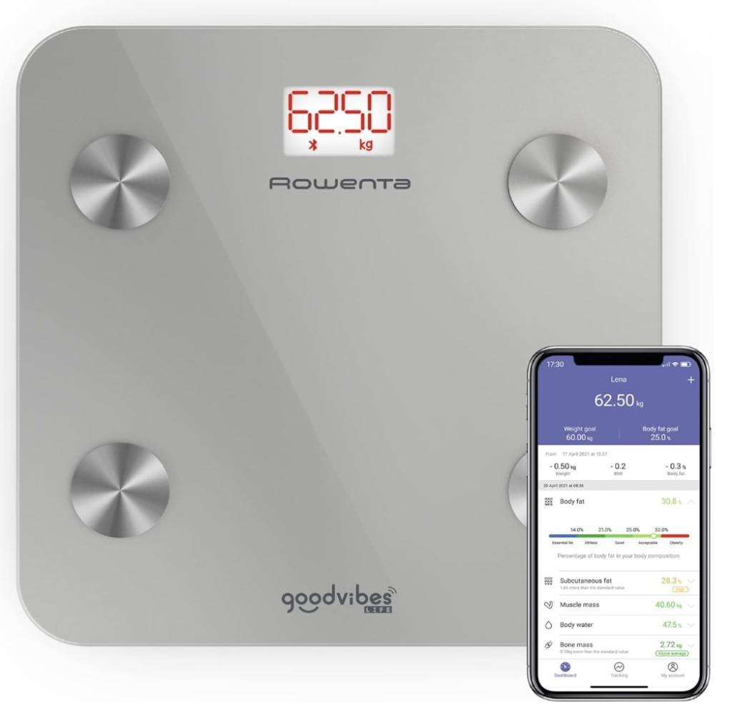 Ahora es el turno de otra báscula sencilla para el uso doméstico pero que da muy buenos resultados. Hablamos de Goodvibes Life de Rowenta, que cuenta con 10 parámetros de medición inteligente entre los que encontramos el IMC, la masa y grasa corporal, el agua corporal, grasa subcutánea, etc. y calcula también la edad metabólica. El rango de medición va desde los 8 KG hasta los 160 KG. Puede registrar tantos usuarios como quieras, presenta conectividad Bluetooth y es compatible con aplicaciones como Apple Health, Google Fit o Fitbit.