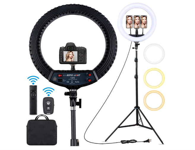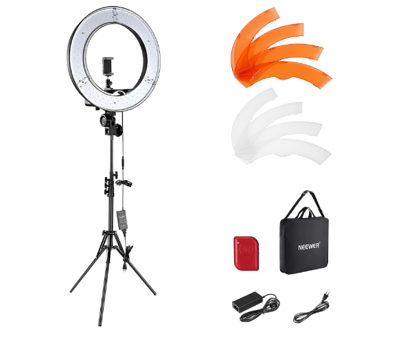Neewer es una marca muy reconocida en el sector fotográfico y este aro de luz de 18 pulgadas proporciona una salida equilibrada de luz natural a 5500K. Incluye filtros blancos y naranjas, soporte para cámara, resistente soporte de luz y una práctica bolsa para transportarlo todo. Eso sí, no es el modelo más portátil que vayas a encontrar, pero su calidad y confiabilidad sorprenden. Es fácil de montar y usar, ofrece una iluminación brillante ajustable y mejora significativamente la calidad visual en plataformas como Instagram, TikTok o YouTube.