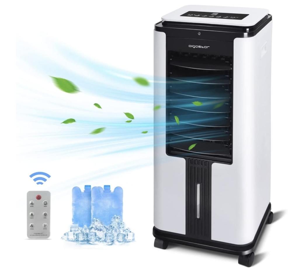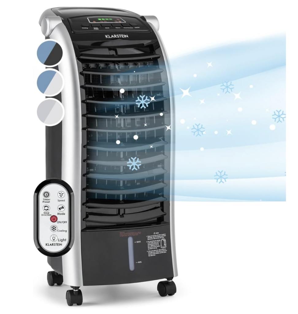 Nos ha gustado la solución que nos presenta Klarstein en su climatizador evaporativo Maxfresh que garantiza una temperatura agradable durante 5-6 horas con su generoso tanque de 6 litros. Cuenta con 3 modos y 3 velocidades junto a un caudal de aire de 444 metros cúbicos por hora y oscilación de 90º, perfecto para estancias medianas.