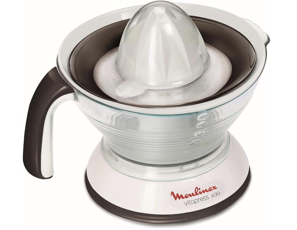Carece de recipiente para recolectar el zumo y genera cierto ruido, pero su versatilidad y eficiencia, además de su gran relación calidad/precio, le otorgan buenas valoraciones. Exprime cítricos de diferentes tamaños gracias a sus conos desmontables y palanca de presión ergonómica, además sus piezas son aptas para lavavajillas.