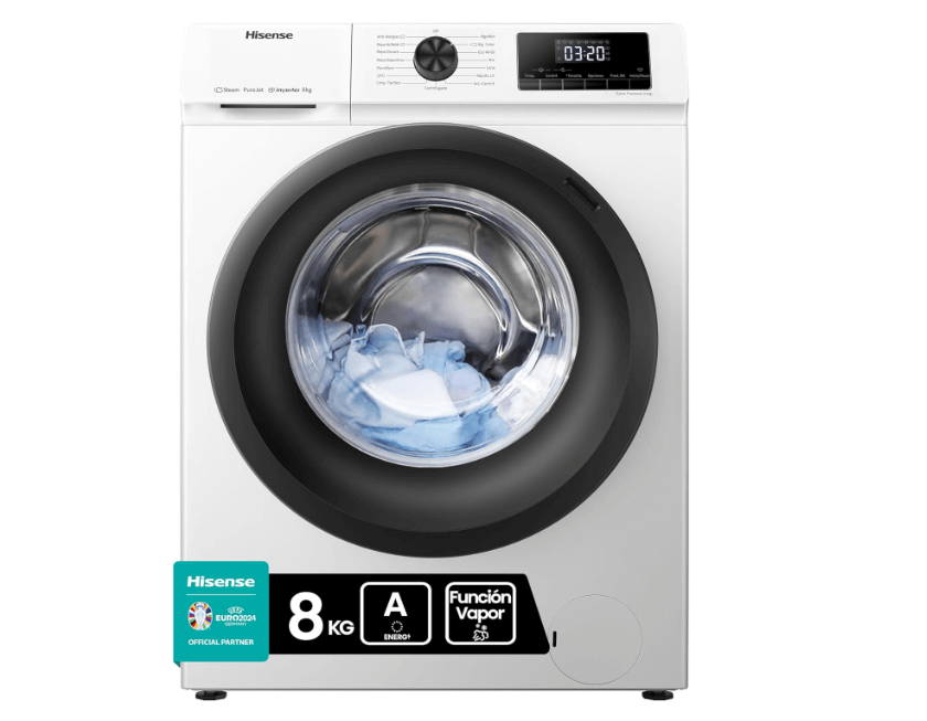Continuamos con esta lavadora Hisense WFQE8014EVJM que también se convierte en una de las opciones más destacadas si tenemos en cuenta la relación calidad/precio. Se trata de una lavadora con una capacidad de 8 kg y múltiples programas, siendo una opción perfecta para hogares pequeños/medianos que buscan eficiencia en el espacio y un buen consumo energético.