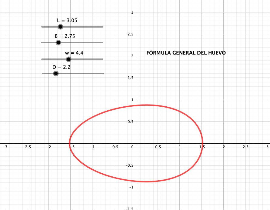 En las conclusiones del artículo recogen los cuatro parámetros necesarios para caracterizar cualquier huevo: longitud del huevo (L), anchura máxima (B), desplazamiento del eje vertical (w) y diámetro a una distancia de un cuarto de la longitud del huevo, medido desde el extremo más estrecho DL/4). La fórmula puede echar atrás a cualquier persona, pero no es difícil de implementar en un programa de representación gráfica de funciones. Lo hemos hecho con GeoGebra, que es una herramienta de representación gráfica educativa. Es intuitiva y puede que hasta divertida. También puede representar huevos piriformes con GeoGebra.
