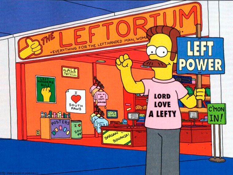 Ned Flanders, el vecino de los Simpsons, decide en uno de los capítulos abrir una tienda con productos para zurdos, llamada The Leftorium. En el mundo real, el primer establecimiento especializado en este tema fue abierto en Londres y se llama Anything Left-Handed.Hoy en día, y sobre todo gracias al comercio on line, los zurdos lo tienen más fácil y han proliferado productos y gadgets como plumas diseñadas para que no se corra la tinta, abrelatas, tijeras, sillas con mesa acoplada en el lado izquierdo y un largo etcétera.
