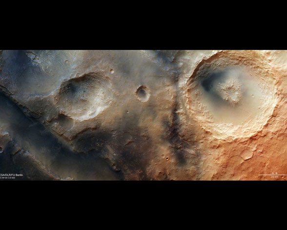 Cráteres que un día estuvieron rebosantes de agua y sedimentos hoy se muestran completamente secos, pero el rastro de aquella larga vida como lagos fangosos sobrevive ante la amenaza del tiempo. Esta fotografía muestra el grabado fruto de la erosión del agua en las paredes de los cráteres y es una evidencia del pasado activo de Marte durante su era Noeica, hace unos 4.000 millones de años. La captura está tomada en una región montañosa del sur del planeta, al norte de un antiguo cauce de río conocido como Tagus Valles. El cráter principal tiene 34 kilómetros de diámetro y un fondo escarpado resultado del depósito de sedimentos. El agua y las erupciones volcánicas han jugado un papel fundamental en el modelado del relieve marciano.Fotografía: ESA/DLR/FU Berlin (G. Neukum)