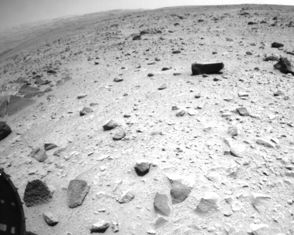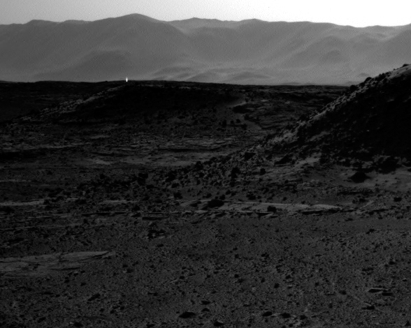 El rover Curiosity de la NASA ya ha recorrido sobre Marte más de un kilómetro (exactamente 1,029 cuando se tomó esta fotografía) en su viaje iniciado este mes hacia el Monte Sharp. Esta misión, que se prolongará durante varios meses, busca analizar las estratos inferiores del terreno para esclarecer la evolución del medio ambiente marciano. En la anterior misión del rover ya se obtuvieron evidencias de un antiguo entorno que reunía las condiciones de humedad necesarias para albergar vida microbiana. Hace ya casi un año que el Curiosity aterrizó en la superficie del planeta.