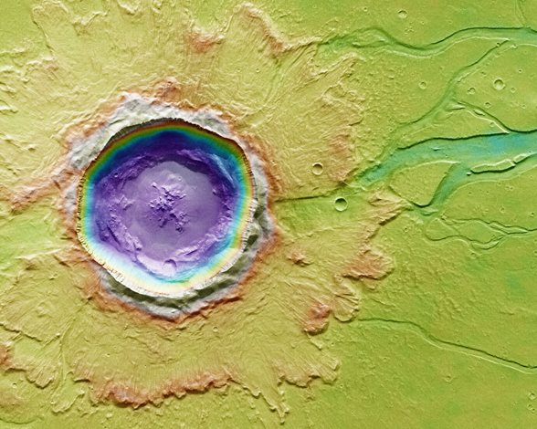 Esta peculiar imagen tomada por la sonda Mars de la Agencia Espacial Europea (ESA) muestra un cráter de 20 kilómetros de diámetro excavado por un asteroide en la superficie de Marte. Cuando un cometa o un asteroide choca a gran velocidad con otro cuerpo del Sistema Solar, la energía liberada provoca que el punto de impacto se caliente drásticamente. En el caso de este cráter, el calor generado por la colisión derritió el terreno, compuesto de roca, polvo y hielo, provocando un desbordamiento que inundó sus alrededores. Antes de secarse, los lodos excavaron una compleja red de canales mientras se abrían paso sobre la superficie del Planeta Rojo.
