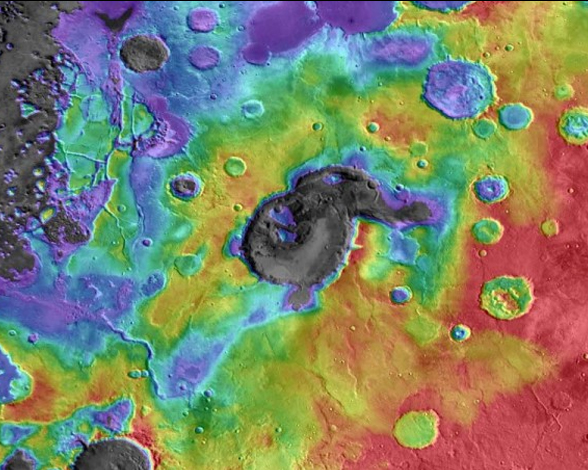Ya en 1972, gracias a la nave espacial Mariner 9 de la NASA, pudimos saber que en Marte están los volcanes más grandes del Sistema Solar. Por ejemplo, el Olympus Mons es más del doble del tamaño del Everest. Ahora, según han descubierto los investigadores, en el planeta rojo se produjeron durante sus primeros mil millones de años erupciones volcánicas gigantescas, mucho mayores que las peores en la historia de la Tierra. En la imagen se observa, la caldera del Eden Patera, un antiguo supervolcán, donde el rojo indica altitudes más altas, mientras que el negro, azul y púrpura muestras zonas más bajas.