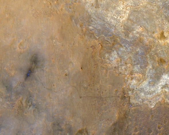 La sonda de la NASA Mars Reconnaissance Orbiter ha fotografiado la posición del rover Curiosity (esquina derecha inferior) junto al rastro dejado por sus ruedas. En la zona izquierda vemos dos marcas azules rodeadas de una mancha oscura: es el punto en el que aterrizó la nave del Mars Science Laboratory el pasado 6 de agosto, retirando parte del polvo de la superficie del planeta en su llegada. Para hacer una aproximación a la escala, la distancia que separa las dos líneas paralelas del rastro del rover es de tres metros. La fotografía se tomó el día 27 de junio, cuando el Curiosity se situaba en una zona cercana al Cráter Gale. Posteriormente el rover se alejó hacia el suroeste.