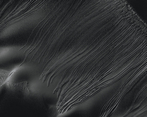 Las últimas investigaciones de la NASA han descubierto el origen de las cárcavas que se forman en las dunas de arena de Marte. Según los resultados, fragmentos de dióxido de carbono congelado, también conocido como hielo seco, podrían deslizarse por las dunas por encima de cojines de gas, arando a su paso los surcos que se reconocen en esta imagen. Mediante la comparación de imágenes sucesivas, los científicos han estimado que estos surcos se formarían durante la primavera. Foto: NASA / JPL-Caltech / Univ. de Arizona.