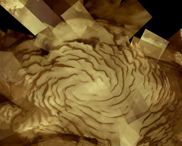 Este mosaico de 57 imágenes tomadas durante la misión Mars Express presenta el tapón de hielo del polo norte de Marte. Las fotografías fueron tomadas cuando Mars Express estaba en su punto más cercano al planeta rojo, a unos 300-500 kilómetros de altitud. Foto: ESA/DLR/FU Berlin–G. Neukum; F. Jansen (ESA).