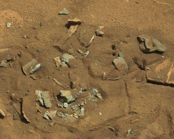 Esta imagen de la superficie de Marte tomada por el Mars Rover Curiosity de la NASA ha creado todo tipo de especulaciones sobre la posibilidad de que, lo que ves en la parte superior de la misma, sea un hueso de un ser vivo. Pero la agencia americana ha salido al paso para desmentirlo rotundamente: "No son los restos de un misterioso marciano". De hecho, según apunta la NASA, “si alguna vez existió vida en Marte, los científicos esperan que sean pequeñas formas de vida muy simples”. Y es que el planeta rojo probablemente nunca tuvo el oxígeno suficiente en su atmósfera u otros lugares para permitir la vida de organismos más complejos. Así pues, lo más probable (por no decir que es la única explicación científica posible) es que simplemente se trate de una roca esculpida por la erosión que ha adoptado una forma muy parecida a la de un fósil cualquiera.