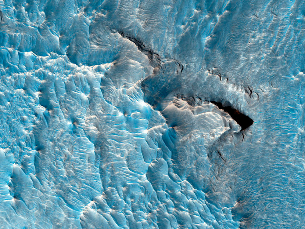 En Marte, la NASA observa las pendientes del planeta que muestran flujos helados o glaciares. La región que se presenta aquí, en la ladera orientada hacia el sur de un cráter, es inusual porque los flujos tienen reflejos brillantes. Es probable que las variaciones de color y brillo se deban a recubrimientos superficiales de polvo brillante y arena oscura. La imagen se captó en octubre de 2017.