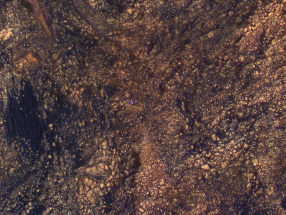 En el centro de la imagen, se puede apreciar un minúsculo punto azulado. Dicha marca brillante es nada menos que el rover Curiosity Mars de la NASA en el flanco noroeste del Monte Sharp. La fotografía está tomada en verano de 2017 por la cámara HIRISE desde la órbita de Marte. HIRISE ha estado visualizando Curiosity aproximadamente cada tres meses para supervisar las características circundantes de cambios como la migración de dunas o erosión.