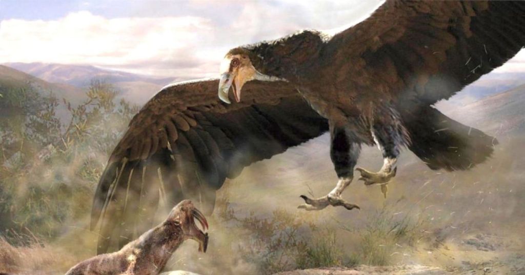 Unas alas enormes apenas necesitan batirse para sobrevolar en grandes círculos las grandes planicies que se extienden bajo los Andes. Una vista infalible identifica una presa que acaba de salir de su madriguera. Argentavis magnificens se deja caer desde los cielos a la superficie. Atrapa con sus fuertes garras a su víctima, con su peso sofoca todo intento de escapar y con su poderoso pico asesta un golpe definitivo. Uno de los mayores depredadores del pasado americano se dispone entonces a comer.