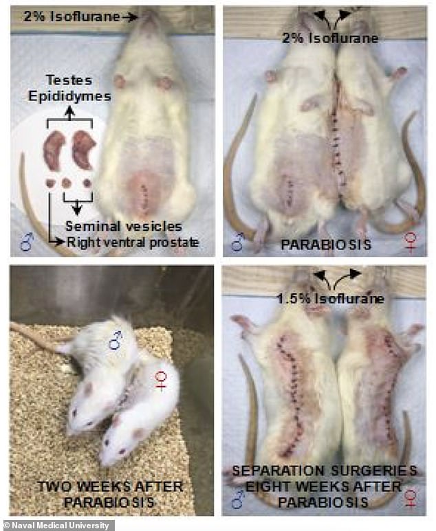 Concretamente, la unión (que recuerda a Frankenstein) de un ratón macho y hembra uniendo su piel y compartiendo su sangre, se sucedió trasplantando un útero en el macho y también implantando embriones en ratas macho y hembra. Los científicos esperaban que la sangre de una hembra embarazada ayudara al macho a tener descendencia.