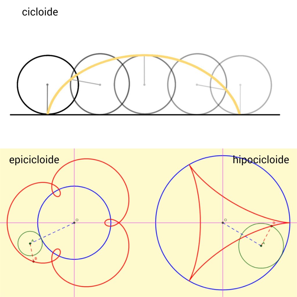 Uno de los principios de las matemáticas (y quizá de la mente humana) es construir estructuras cada vez más complejas a partir de estructuras simples. Los griegos crearon así figuras complicadas a partir de la recta y la circunferencia. Haciendo girar una circunferencia sobre una recta y tenemos la cicloide; si gira por el exterior de otra circunferencia conseguimos las epicicloides y si lo hace por el interior, la hipocicloide. Otras, las trocoides, están generadas por el movimiento de un punto ligado a una rueda, pero no en un borde, sino más lejos. Si rueda por una recta tenemos la epitrocoide; si es por el exterior, hipotrocoide.