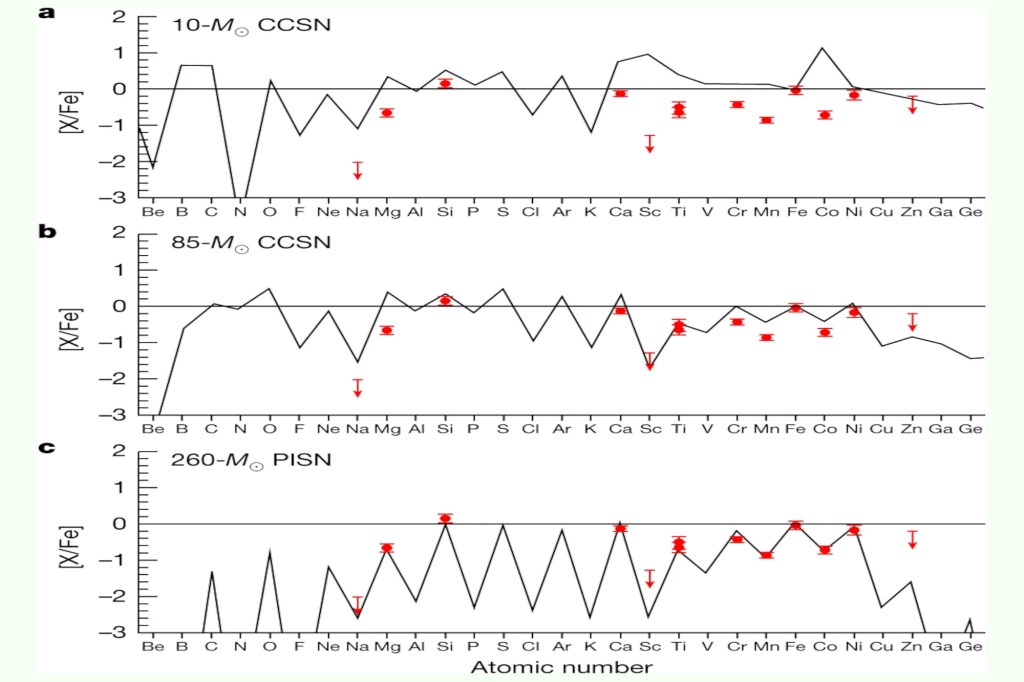 De entre aquellas estrellas increíblemente masivas que se formaron entre 100 y 200 millones de años después del Big Bang, se estima que las estrellas con masas comprendidas entre las 140 y las 260 masas solares deberían acabar sus días con una explosión de supernova de inestabilidad de pares. Este tipo de supernovas son muy diferentes a los tipos que observamos habitualmente y dejan una huella química tras de sí muy característica, pues la energía liberada durante la explosión permite la creación de nuevos elementos químicos en grandes cantidades. Sin embargo, nunca se ha detectado esta huella química, hasta ahora.