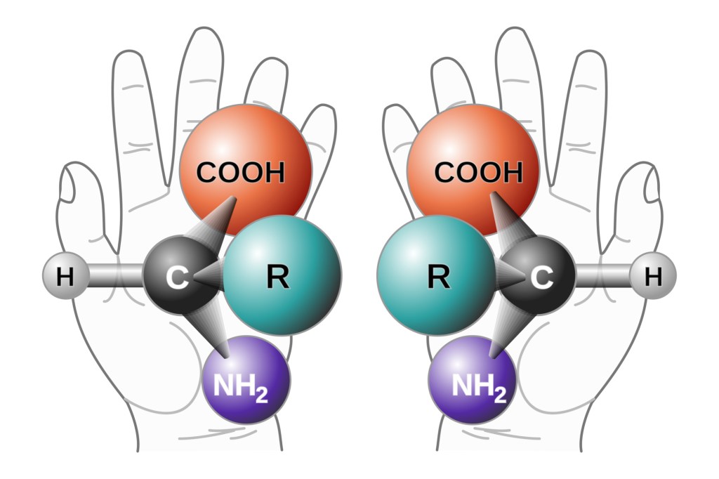 A esta propiedad se la conoce como quiralidad. Las moléculas pueden presentar una orientación levógira (o a izquierdas) o dextrógira (o a derechas). Los aminoácidos presentes en la vida terrestre son todos levógiros, pero no lo son los observados en muestras provenientes del espacio. Las dos versiones de una molécula con quiralidad se conocen como enantiómeros y aunque tengan la misma fórmula y composición química, la forma en la que interactúan con otras moléculas puede variar mucho.
