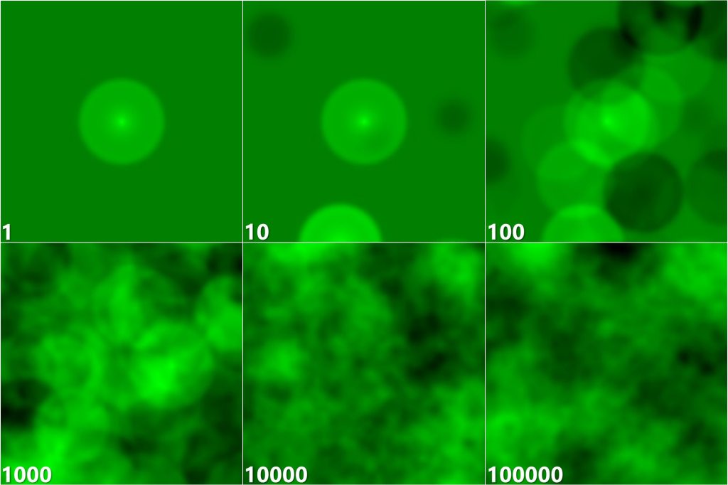 Si por simplicidad asumimos que todas estas acumulaciones ocurrieron de forma perfectamente esférica, puede verse fácilmente que al combinar suficientes de estas capas esféricas, aparece un patrón que a ojos humanos parece aleatorio, como se muestra en la imagen superior. En ella se muestra el efecto de combinar una cantidad creciente de estas capas. Cuando combinamos varios miles, la información de cada capa individual parece perderse, dominando el patrón aleatorio. El hecho de que esta simulación sea tan similar al fondo cósmico de microondas nos indica que el universo evolucionó en sus inicios de la forma que hemos explicado más arriba.